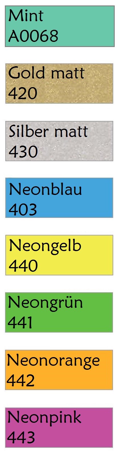 Mit Ausnahme der Farben Hellblau, Gold matt, Silber matt und den Neonfarben können die Folien dieser Serie übereinandergepresst werden.